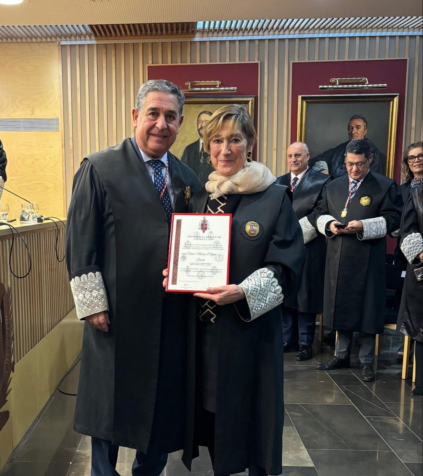 Ortega ha recibido la Gran Cruz de manos del presidente del CACYL, Julio Sanz Orejudo, en un acto formal al que han acudido todos los miembros actuales del Pleno y varios exconsejeros. Además, han asistido otras autoridades de la abogacía de toda España, como los presidentes de los consejos de la Abogacía de la Comunidad Valenciana y de las Islas Canarias o el decano de Cantabria, además del presidente de la Mutualidad de la Abogacía y exconsejero del CACYL, Enrique Sanz Fernández-Lomana.